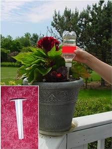 These inexpensive little gadgets are lifesavers if you travel or need to leave plants unattended for long periods of time. I collected a few beverage bottles (small lids, like on water bottles and single-serve soft drink bottles, work far better than wider lids) and used a drill to pierce holes in the lids. Slid the water nozzles through, filled the bottles with water, screwed the lids on, and that's it.