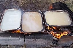 My own sugaring set-up is total simplicity: just some old refrigerator grates set on top of cinder blocks, heated with odd scraps of wood that fell from trees in our woods, or that others have thrown away at construction sites, etc. (Much better than having those go in the landfill!) The sap is boiled down in flat baking pans, then finished off on the stove inside. Except for the initial expense to buy some professional spiles for tapping (you can make those, too, but I'm a failure as a tinsmith) and the propane it takes to finish a batch, I have spent ABSOLUTELY NOTHING for the 3-4 gallons of syrup we make each year. Not a bad return for a book that I cost me less than ten bucks!