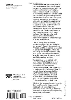 Unbelievable. That is the only word for the negative reviews....If you don't want anything other than a good laugh, sort these reviews with the most negative first. Who do these people think they are, calling Bertrand Russell a "fool" and a "hack"? And do those reviewers who cite to Acts of the Apostles and Paul's letter to Romans, the Epistles to Timothy et al, do they really think that is "evidence" to refute Mr. Russell's positions? Many years ago, during my first year in college, my humanities teaching assistant explained to our little section that there are basically two writing styles: Kant and Russell. Russell worked hard to write clearly, and consequently, readers of his works are able to chart the inconsistentcies and changes in his philosophy over time. Kant's style, on the other hand, was to write in such a manner that no one in their right mind could be certain what Kant was trying to say. As a result, everyone today still believes Kant to be brilliant. Our section was to strive to be Russell, and not Kant (The sucess of our striving was largely mixed and debatable, but that is beside the point). Russell is a good writer--and this book adresses the subject. For me (and I am speaking only for myself here--I'm not calling anyone a fool or a pervert or trying to create a strawman. If you think I am, my e-mail address is available, so please write me--if you care. I'll edit this review), this book addresses Blaise Pacal's rationale for "faith:" If you believe in the christian god, and there is no god--you really have not lost anything. But if you do not believe in the christian god (or whatever system of beliefs is at issue), and it turns out to be "true"--why, you've lost a whole big bunch, swimming around in that lake of fire.....Read more ›