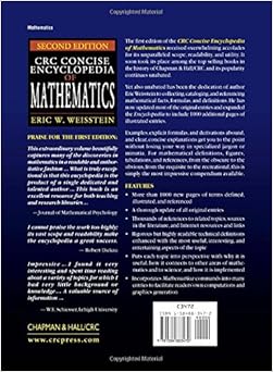CRC Concise Encyclopedia of Mathematics is a compendium of mathematical definitions, formulas, figures, tabulations, and references. Its informal style makes it accessible to a broad spectrum of readers with a diverse range of mathematical backgrounds and interests. This fascinating, useful book draws connections to other areas of mathematics and science as well as demonstrates its actual implementation - providing a highly readable, distinctive text diverging from the all-too-frequent specialized jargon and dry formal exposition.