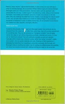 This doesn't feel like a book - literally. It's a different size and shape, the pages are thick, the thing feels significantly heavier than it looks, and it's waterproof. The design of the book is making a point also made in the text of the book: the current state of recycling generally turns higher quality products into lower quality ones useful only for purposes other than the original product, and then eventually discards them. This is not recycling; it's slow motion waste. "Cradle to Cradle," the object, is intended to be easily and completely recyclable into a new book of the same quality. "Cradle to cradle," the phrase, is contrasted to "cradle to grave." "Cradle to Cradle," the text, argues in favor of making all human productions either recyclable in the way this book is or completely biodegradable so that they can be used as fertilizer. In the future envisioned and partially created and described by this pair of authors, packaging will be tossed on the ground in response to signs reading "Please litter!" Appliances will be leased and returned to manufacturers to be completely recycled. Objects that must contain both biodegradable and inorganic recyclable elements will be easily separable into those respective parts: you'll toss the soles of your shoes into the garden and give the uppers back to the shoemaker. And the water coming out of factories will be cleaner than what came in, motivating the factory owners to reuse it and eliminating the need for the government to test its toxicity. These authors teemed up on the 1991 Hannover Principles to guide the design of the 2000 World's Fair. McDonough has an architecture firm in Charlottesville, Va.Read more ›
