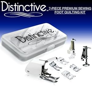 Comes With Even-Feed Walking Foot, Large Metal Darning Foot, Embroidery/Darning Foot, 1/4" Quilting Foot, Satin Stitch Foot, Open Toe Foot, Applique Foot, a retail value of almost $90, for only $49.99! The Even-Feed Walking Foot - This foot adds more feeding power to your machine thanks to the upper feed dogs found on the foot. This foot is perfect for feeding multiple layers of fabric and quilts. The Large Metal Embroidery/Darning Foot - This foot has a large hole and metal making it heavy-duty and perfect for quilting, darning and free-motion embroidery. The Embroidery/Darning Foot - This foot gives the user the ability to do quilting, darning and free-motion embroidery. The clear view allows the user to easily see their project from underneath the foot. The 1/4" Quilting Foot - This Metal 1/4" foot helps the user create a quilt with a perfect 1/4" seam allowance. Simply following the edge of your fabric with the edge of the foot will give you a 1/4" every time! The Open Toe Foot - This foot is used when appliqueing, matching patterns and more. This clear foot gives amazing visibility while sewing. The Applique Foot - This foot is shorter than most allowing you to easily maneuver around corners and curves when sewing applique pieces. It's clear plastic constructions gives you greater visibility. The Satin Stitch Foot - This foot is great for dense zig-zag stitching and has a beveled bottom for smooth thread delivery when sewing decorative stitches. All of the feet found in the Distinctive Quilting Package are stored in Distinctive's Deluxe Sewing Foot Case - So you never have to worry about losing your feet! The Distinctive Quilting Package comes packed with Instructions. Fits All Low Shank Snap-On (Top-Loading Drop-In Bobbin Machines Only) Singer, Brother, Babylock, Euro-Pro, Janome, Kenmore, White, Juki, New Home, Simplicity, Necchi and Elna Sewing Machines
