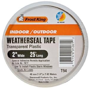 Frost King Clear Plastic Weather-seal Tape can be used indoors or outdoors, because it is completely weatherproof and can withstand extremes of both heat and cold. It is ideal for installing plastic storm windows, sealing air leaks, repairing cracked glass and much more. It has a special adhesive system which permits application even at ten below zero temperatures.