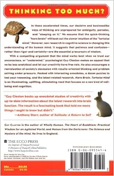 Laboratory studies of subliminal perception, problem solving, and creativity point to a cacophony of intelligent voices murmuring just below our conscious levels of awareness yet influencing our behavior in subtle ways we are only just beginning to understand. Claxton argues persuasively that this unconscious intelligence is just what we need to handle complex situations, and that our culture's misplaced emphasis on logic and reason to the exclusion of all else is foolish, and even hypocritical, as most scientists will readily admit to abandoning their left-brains on occasion for bursts of nonlinear, inspired thinking. But his prose is never preachy; in fact, he sounds as warm and wise as the Buddhist monks he has studied with. If you're looking for a new way of thinking about thinking, you'll find it in Hare Brain, Tortoise Mind. --Rob Lightner