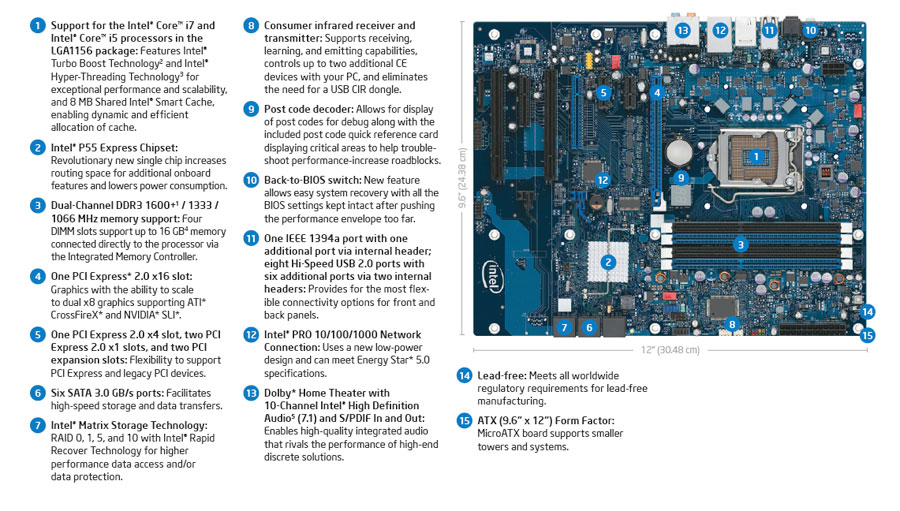 Compatible with Intel Core i7-800 and Core i5-700 series processors, the Desktop Board DP55WG is an ideal motherboard for enthusiasts looking to build a cutting-edge PC without breaking the bank. Based on the P55 chipset, the DP55WG supports all processors with LGA1156 sockets, and fully supports ATI CrossFire and NVIDIA SLI technology. The DP55WG is an ATX board and measures 12 by 9.6 inches. It is packed with enough PCI connectors, DDR3 memory sockets, and peripheral ports to satisfy the most demanding users.