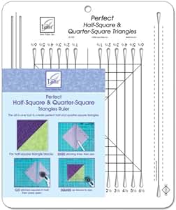 Perfect Half Square and Quarter Square Triangles Ruler. This all-in-one tool is for creating perfect half and quarter-square triangles for quilting. This cut-through ruler has measurements starting at 1-1/2 inch and continuing to 6-1/2 inch in 1 inch increments and 45 degree angle markings. Ruler is constructed of clear flexible acrylic and measures 12-1/2 by 10-1/2 inches. Made in USA.