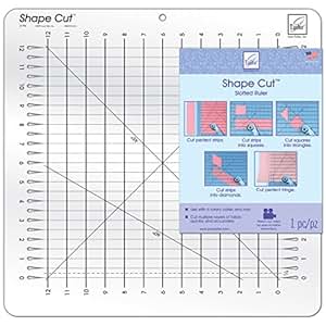 Shape-Cut Rotary Cutting Tool cuts multiple strips in .5 inch increments quickly and accurately. After cutting strips, turn ruler to complete squares, triangles, diamonds, and hexagons. Use this ruler to fringe. Cuts several layers of fabric at one time. Cuts strips up to 16 inches. Tool measures: 16 by 16.5 inches.
