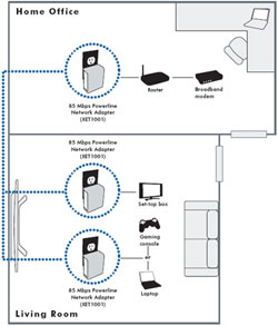 Create a Network Connection Anywhere in Your Home By harnessing the electrical wiring in your home to transmit data, the Powerline lets you create network connections practically anywhere in your home, in places where a wireless signal can't reach and where it would be difficult to run an Ethernet cord. This network adapter kit is perfect for connecting game consoles, network storage devices, Slingboxes, and more.