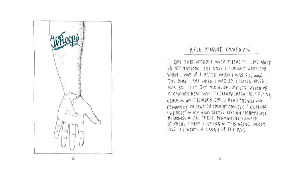 While the stories are often serious, the book is presented in a whimsical fashion with the tattoos drawn in 4-color illustrations rather than photographs, and the essays are printed using a handwriting-style font. At first glance it resembles a graphic novel.