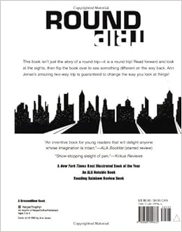 "Round Trip" is a book with a surprise! Each black and white scene tells half of a story and then the book can be turned upside down to tell the second half. Drawings work either right side up or upside down and are visual delights. We read it over and over.