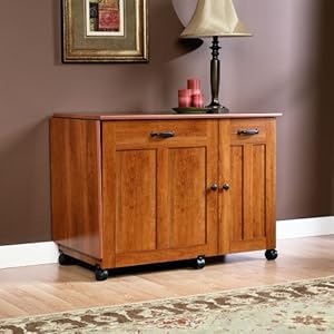 Drop-leaf for extra work surfaceRoll-open door includes two storage binsAdjustable shelving behind right doorAmerican Cherry finish.American Cherry