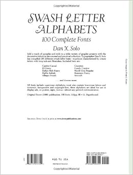 Add a touch of panache and style to a wide variety of graphic projects with the decorative letters in this unusual and practical collection. Typographer Dan X. Solo has compiled 100 different swash letter fonts — typefaces characterized by ornate letters with long tails and flourishes. Included here are: Cantini Casual; Cranston; El Greco; Goudy Cursive; Italian Slab Fancy; Mardi Gras Regular; Raffia Initials; Rousseau Fancy; Allegro Swash; Artcraft and dozens more. All fonts include uppercase alphabets; most also contain lowercase letters and numerals. Inexpensive and royalty-free, these alphabets are ideal for use in display ads, on posters, signs, menus — almost any printed communications.