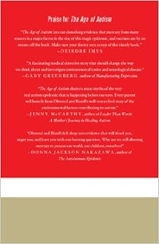 “The Age of Autism lays out disturbing evidence that mercury from many sources is a major factor in the rise of this tragic epidemic. And vaccines are by no means off the hook. One wonders why doctors who gave children multiple vaccinations loaded with the neurotoxin thimerosal (mercury) didn’t also hand the kids a pack of cigarettes. Make sure your doctor sees a copy of this timely book.”-Dierdre Imus
