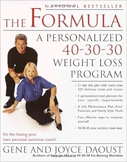 To help put you on the track to successful weight loss (and maintenance), the Dousts, who worked with Dr. Barry Sears to develop and test the 40-30-30 Zone nutrition program, have written The Formula: A Personalized 40-30-30 Weight Loss Program. The Formula is based on the premise that if each meal or snack contains 40 percent of its total calories from carbohydrates, 30 percent from protein, and 30 percent from fat, your body will maintain the proper balance of insulin to glucagon and thus burn excess fat all the time--even while you sleep.