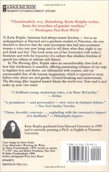 I just finished rereading The Morning After. In it, Katie Roiphe makes no claim to having all the answers, but she notes (in a quietly expressed, earnest, rational and refreshingly non-shrill style) that the notion of "feminism" she developed as a young girl growing in her home had no resemblence to the "feminism" she encountered at college, which was obsessed with women solely as the victims of men. She points out - with good reason, judging by the venomous remarks of those who've given her bad reviews here, that it was acceptable for these feminists to stifle dissent and pass that off as an argument. It was acceptable to lie about being raped, as one female student admitted doing, until the alleged rapist, who didn't even know her, threatened legal action. As for Roiphe's "making fun" of rape victims, that's just hooey.