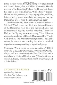 Michael Walsh, former associate editor of Time Magazine and a columnist for The New York Post delivers harsh facts and arguments, after tracing the history of the Democrats from Aaron Burr, and the founding of the big-city political machine. He reveals about facts gathered involving crime, scandals, and much more as the war on America continues. The arguments and facts presented are not only thought-provoking throughout, but will certainly make you ponder long after this book is closed. Informative, Educational, and Highly Recommended!
