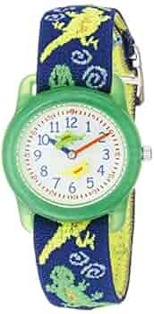 The Kids' Geckos Stretch Band Watch by Timex is a delightful timepiece with great design, function and playful geckos everywhere! The plastic white dial has stationary bezel around the sturdy, plastic case and features two geckos who chase each other as minutes and hours pass. The children's-length band sports green and blue geckos and is made of high-quality, Scotchguard-protected elastic, which is easy for kids to take on and off. While this watch is all about fun, with qualities like a glow-in-the-dark feature and water resistance to 99 feet, it's both practical and durable for the most active of kids. This watch is backed by a one-year manufacturer's warranty.