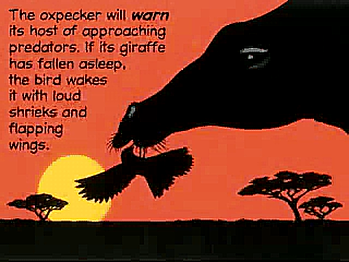 Would you let an oxpecker climb into your ear? Would you let an African helmeted turtle nibble at your jowls or sit on your back? There are many relationships between animals that are mutually beneficial. The giraffe gladly allows the oxpecker access to its ears because the little bird will rid it of unwelcome parasites such as the tick. Other animals such as the rhino, the deer, the African buffalo, and the zebra welcome the services of this little song bird, a bird who depends on them to find its food. The hippopotamus' skin can easily become "covered with algae and water plants." The African helmeted turtle happily nibbles "away unwanted greenery" from the hippo's skin and then basks his cold-blooded body on the hippo's back.