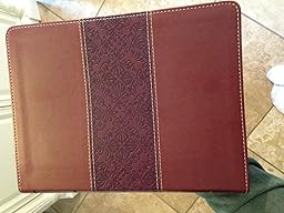This is a very beautiful bible! It has a very pretty cover with a reddish-brown color and a dark brown strip in the center. It is rather large and heavy but makes it seem very durable in my opinion. The pages are thick paper so pen and even marker does not bleed through. I think it's a great price for a quality bible and it's perfect for those of us that like to take notes as we study. I only wish there was a better description and better pictures. I really had no idea what I was getting until it came in. Luckily I love it!