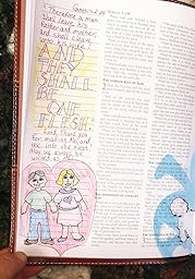 Thank you to everyone for their reviews and your photos - you helped me make up my mind! That's why I'm posting one w/ photos. I had originally ordered a completely different journaling bible in February, but it took them so long to mail it, that I finally canceled my order. I am very glad I changed my mind. I was going to get one of the versions that has 400 pieces of artwork in the bible to color with some space to do my own artwork and/or journaling. Most people gave that bible rave reviews, but one person said it was a little annoying because there was so much artwork that there was not enough space to pen her own thoughts. That was the comment that helped me make up my mind. I decided to get a bible just for my own thoughts. If I want to color, I will buy a coloring book. I sometimes just want to write a few thoughts down with minimal artwork, but sometimes I may want to create a bit of artwork too if I so choose. I like having that option. Plus this is all about what inspires me, not about what has inspired some random artist I don't even know. I did not buy some fancy journaling kit either. I just got some inexpensive gel pens and mechanical pencils and I have used coloring pencils and stencils I already owned. I would like to buy some highlighters that don't bleed through. Whatever design you want, there are many different versions out there. I would recommend doing as I have done, and read a ton of reviews on each bible. I think anyone you bought would be a blessing. For me, I was more interested in the journaling aspect than the coloring side. Although I will buy a few inspirational coloring books in the future as well. Mel wasn't sure he would want a journaling bible, but after seeing mine, he wants one too. Guess what I'll be buying him with my first full paycheck!!