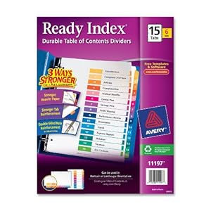 • Save Big On Open-Box & Used Products: Buy "Avery Ready Index Table of Contents Dividers, 15-T...” from Amazon Open-Box & Used and save 69% off the $35.49 list price. Product is eligible for Amazon's 30-day returns policy and Prime or FREE Shipping. See all offers from Amazon Open-Box & Used.