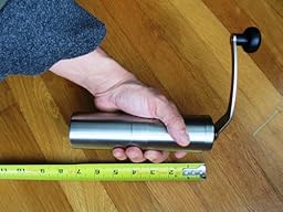 A few observations that might be helpful for anyone else thinking of buying this. The grinder is long and narrow, very similar ergonomically and aesthetically to a medium sized high-end pepper mill. I've had to adopt a different "technique" for grinding than my old box grinder. Essentially I use it just like a pepper mill, with both hands going in opposite directions while grinding, in order to generate enough force. This may seem like a small and insignificant thing, but for the people who want to grind directly into the portafilter or into an aeropress, and to keep the bottom of the mill stable in one place, I can imagine that it would be harder than first thought.
