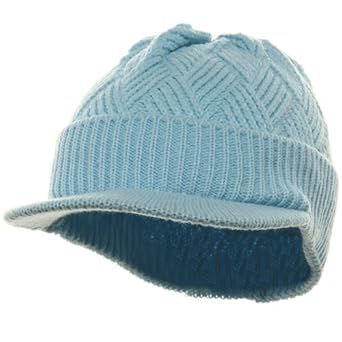 Cool in style, big on warmth, yet light in weight, choose this solid baby blue textured beanie with visor and cuff to warm you through the winter. Constructed out of 1 panel of chunky acrylic basket weave knit, the generous crown is gathered at the top for a roomy dome shape. The hat offers extreme stretch and flexibility to top any head shape with ease. The hat comes equipped with an ample fabric covered bill to keep the sun and snow out of your eyes, and is also detailed with a ribbed, elasticized cuff to ensure a secure fit for all. We offer you this simply textured hat in a variety of fashion colors, so, pick out your favorite, and out you go. Made of 100% Acrylic. Crown measures 8 deep, 8 wide. Bill measures 2 long. ONE SIZE fits most, from 6-7 5/8. Hand Wash. Available in Baby Blue, Black, Brown, Burgundy, Khaki, Navy, Red, and White. Imported.