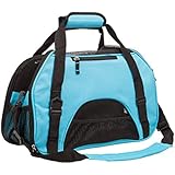 The bag fits perfectly under a plane seat. I would've liked a set of wheels in the base of the bag to drag it around since my cat is really heavy (about 12 lbs) but other than that I have no complaints from this bag. The materials are very resistant and high quality.
