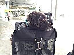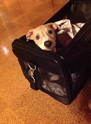 I used this carrier to bring my 9 weeks old Whippet puppy in cabin from Europe to the US. We had absolutely no problems bringing our dog on the plane with us (Lufthansa and United). Our puppy liked to be in the bag and slept through most of the flight (10hrs). Front and top zipper entrances are very well designed and sturdy. Carrying the carrier with the puppy inside was good, using either hand or shoulder strap. All in all I would recommend this bag. I am adding pictures for size reference of the carrier with our pup (4.5 kg at that time) to this review. When I researched for pet carriers, I found pictures with animals next to or inside the carrier very helpful.