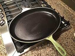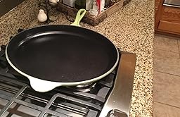 I decided to splurge on this item. I love Le Creuset, and the quality is always top notch. The picture really does make the item look much less oval than what is actually is, however that is what I was looking for. I have a 5 burner Viking gas range, and it worked perfectly with my 2 burners, and distributed the heat wonderfully. I can see this piece being one of my go to pans! Seemed well seasoned out of the box.