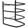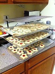 I was shopping for nonstick cooling grids when I stumbled across this Baker's Mate Organizing rack at the bottom of the page. I thought looks interesting, why not? I am not often 5-star impressed with a purchase, but this item satisfied a need I never even realized I had! I live in a small house and LOVE to bake, around the holidays my furniture is often re-arranged to handle cooling racks and cookie sheets waiting to go into the oven. This rack is the best solution EVER! I purchased two of them and can stack four sheets in the counter space of just one; I use one rack for things going IN the oven, the other rack for things going out. It folds up flat and is about the size of a jelly roll pan(would nest inside) but I hang it from a hook on pegboard storage in my closet, along with my other cooling racks. You can also use it as 2 or 3-shelves simply by not opening 1 or 2 of the legs so you could accomodate deeper pans & it still functions properly. It is quite sturdy, and confidently holds four fully loaded 14x20" baking sheets... like my title states, it's one of those things I never knew I needed, but don't know how I lived without! Would highly recommend for anybody who bakes, crafts, or has hobbies that take up lots of horizontal surface space and can be stacked into pans, cookie sheets, dishes or boxes that fit between the racks.