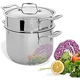This 8-Quart pan is a very nice. I used to have a "non-stick / 99 year warantee" stock pot of the same size, but the coating came off into my cooking -- ick! This stainless cleans up easily, is dishwasher safe, and fits into the dishwasher. The tri-ply technology (aluminum inside, going up the sides) really does seem to help. I've found this pan better than the non-stick coating pans for not sticking, as long as you (1) let food warm to room temperature for 10 to 20 minutes or by warming in water, and (2) pre-heat the pan according to the manufacturor's directions. Though, sticking is seldom problematic for soup. Perfect size for a batch of vegetable soup or chicken stock. Comes with two free inserts, one for pasta and the other smaller, perhaps for use as a strainer. The shape & handles are elegant, and the glass lid really helpful for glancing over to make sure your stock/soup doesn't simmer dry. Highly recommended.