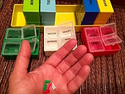 Looks like I'm taking a couple Benadryl, a couple Gas-X, and a Tylenol, right? Nope, these are PLASTIC PIECES THAT BROKE OFF of 3/7 boxes, all around the third week of use. It seems to be a design flaw. All broke at the "evening/noon" side, which has a different attachment for the plastic lid than the "morning/bedtime" side. AND YES I ALMOST SWALLOWED ONE OF THESE! Unacceptable and dangerous. And the ink was already rubbing off, not that it matters much now.