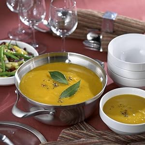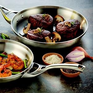 • Full aluminum core that is sandwiched between the stainless steel interior and exterior of each pan, provides superb conductivity and even heating throughout the vessel