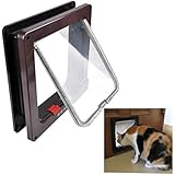 So was it better? Well, the plastic door insert that comes with this aluminum door is better because it has a small metal locking mechanism, so it is slightly more secure than the plastic insert of our previous version. I liked the tinted door flap, which makes it more difficult for people outside the door to see light from inside the house. That also seems to offer slightly better security. The aluminum frame is not really that ornate, however, with screws and metal bolts clearly visible. It looks reasonable once installed however.