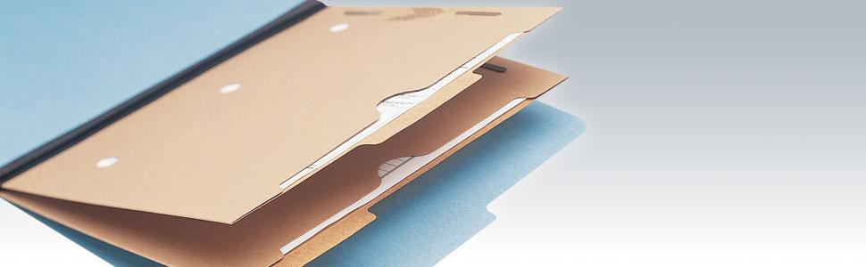 You may also be interested in these: 6 part/two center leaf classification folders with six 1 in. size fasteners 3 Hole Punched Foldout Flap, 0.5 Inch Expansion, 120 Sheet Capacity, 5 Jackets per Pack, Assorted Colors Recycled (50%) Expanding File Pockets, Letter Size, 3.5 in. Expansion, Dark Blue, 25/box