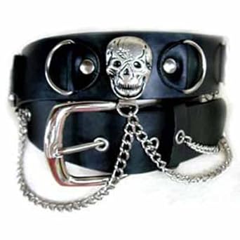 • Gothic styled skulls adorn this belt. Skulls and chains are silver toned.