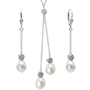 Isabella Rose 9-10mm Cultured Pearl Drop Silver Necklace and Dangle Earrings Set