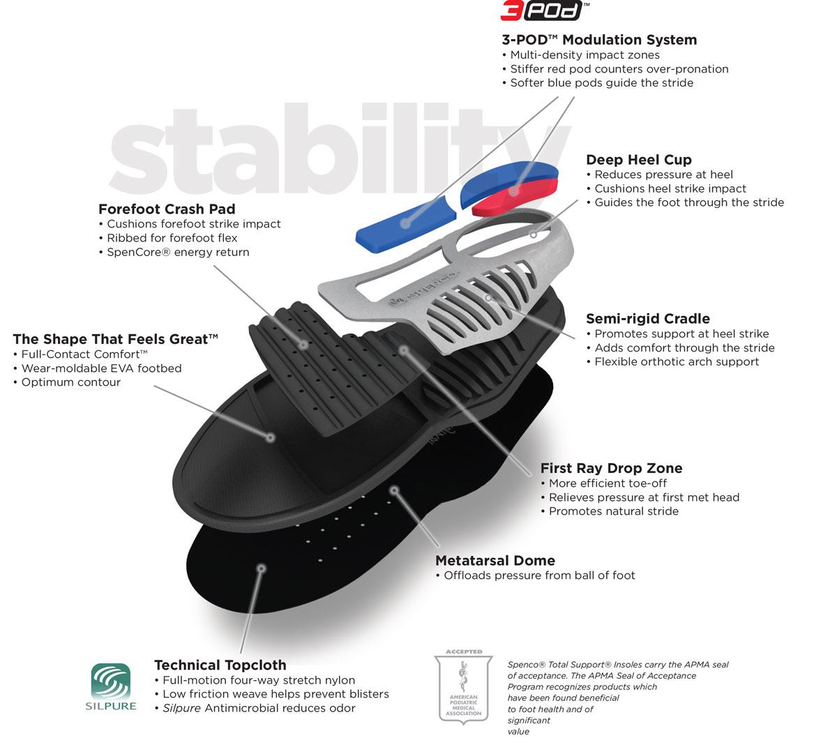 -Overall Spenco Total Support is best insole I have tried out of at least a dozen. It provides total support (heel, arch, etc.), has all the bases covered. It is not deficient in any one area and the best all-around insole. Some insoles are better in the heel, others in the arch, this one is excellent all-around.