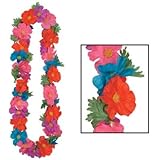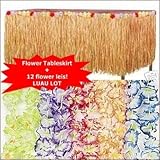 Includes lei necklace, lei bikini top (faux flowers on 2 plastic shells, plus cord), 2 lei bracelets that double as anklets, and a 19" long plastic grass skirt with 21" flowered elastic waistband.