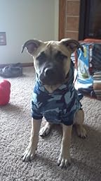 I bought the large size for my AmStaff/GSD mix because it was just too cute. He's still a puppy, so when I bought it for him it was WAY TOO BIG. Now he's 5 months old, and he still has quite a bit of room to grow into it, but it's now wearable. He enjoys it, especially with the cold winter, and I enjoy it because I think it's adorable. I'm not one of those people who dresses up their dog, but I couldn't resist with this hoodie. The pocket on the back is a nice touch, and, even though I can't get the hood to stay on his head for more than a few seconds, that's pretty cute too.