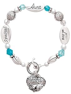 • Silver like and aqua crystal beads decorate this special Aunt Bracelet. A heart charm with Aunt in
