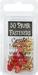 This package of heart-shaped brads (called paper fasteners) from Creative Impressions contains 19 white, 18 pink, and 14 red brads, each about 1 centimeter in diameter. I used four of the pink brads for the anniversary card in the customer image.