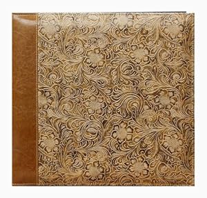 - 12 inch by 12 inch memory book with embossed tan leatherette cover