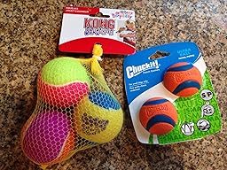 update to original review: I assumed these balls would be the same quality as the all orange colored KONG squeaky tennis balls; however, they are not!! The orange balls last a long time....these NOT SO MUCH, TORN AND RIPPED,SQUEAKER FELL OUT AFTER A WEEK OF PLAYING! Also, one of the balls in the bag was defective and never "squeaked"!! Will not be buying this particular item again.