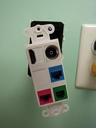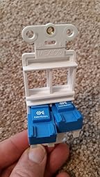 PRO TIP: You do not need to spend $10 each on the Leviton 61110-RW6 eXtreme 6+ QuickPort Connector, CAT 6, White that officially goes with this insert! I ordered a five-pack of UTP CAT6 Keystone Coupler,VCE® RJ45 Female to Female Insert Coupler, UTP CAT6 Keystone inline Coupler -White for just $11. Granted, with those I also had to terminate the cables with RJ45 jacks, but I had plenty of those lying around, and even if I didn't the total cost still would have been a lot less than $40 to populate this insert.