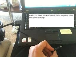 Some reviewers said the audio cable didn't reach the output port on their laptops. They must have humongous laptops; I have a 15.4" Toshiba Satellite, and there is no problem connecting both the VGA and audio output ports (the VGA output is located on the left side toward the rear, and the audio output is located just slightly right of center in the front), and it would easily connect if the two ports were on opposite corners.