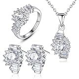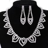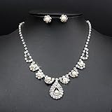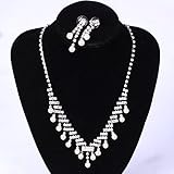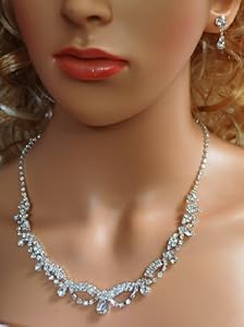 This bridal jewelry set is so affordable that I was a little hesitant to purchase it. However, after receiving the set in the mail, I was glad to see that the necklace did in fact look sparkly and was as nice as the displayed picture. The length of the necklace is adjustable, which is a plus! I would definitely recommend this necklace for any and every bride. I went to David's Bridal yesterday to look at their collections. Their necklaces are made of the same material but cost a bit more money. The bottom line is that they looked pretty similar (David's Bridal offered the same quality costume jewelry), so why pay more at a retail store? The only reason I gave this review four stars is because of the earrings. Just as you see in the picture, the earrings are not as dashing or fancy as the necklace. If the earrings did not have the same teardrop-shaped crystals, you would not be able to tell that they come as a set with the necklace. After putting the jewelry set on, I was very pleased with the necklace but thought that the earrings looked very "cheapy." They actually looked like a little girl's "play/toy earrings." I am planning to use the necklace as is, but I will be purchasing another pair of earrings to go with it. Another fact about the earrings - if you take a look at the picture, you will see that the earring has three crystals at the very top of it, creating a clover shape. Well, my ears are pretty thin (so it isn't the width of my ears that is the problem); however, when I put the earrings on, they didn't tangle at the bottom of my lobes. Instead, they were positioned at the center of them. Therefore, they looked completely out of place and even awkward. Finally, (maybe because the clover hangs from the center of the lobes) the earrings look a little short.Read more ›