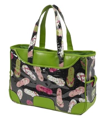 Stylish beach tote features shoulder straps and multiple pockets. Polycanvas interior lining. Designer Cotton outer with vinyl protective cover and faux leather accents. Designed in the USA. Lifetime warranty.