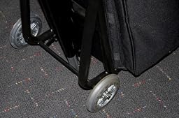 I looked around for a LONG time for a decent bag to haul my photo studio gear on the road. This thing resembles an over-sized golf-bag that fully closes. It's basically a well made bag mounted to a 2-wheel dolly made from 3/4" tube steel. The wheels look like XL "rollerblade" wheels.